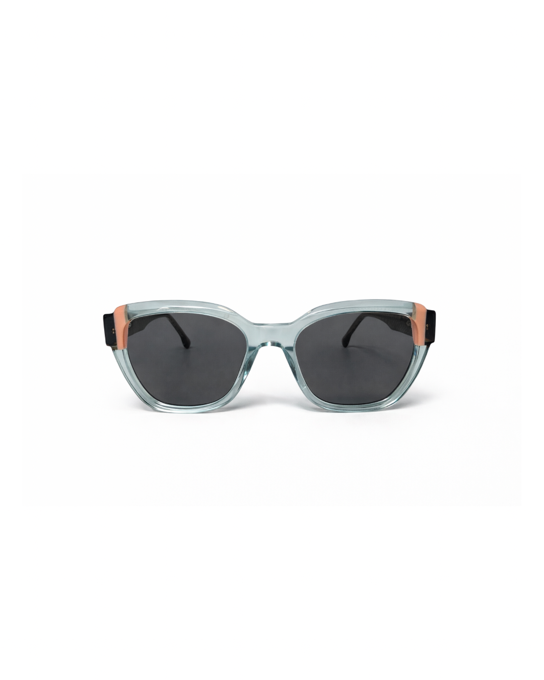 Los colores de las micas y del armazón fueron elegidos según su colorimetría personal. Ella buscaba lentes para sol, por lo que se diseñó un tono que armoniza con la patilla del armazón y potencia su paleta natural.
